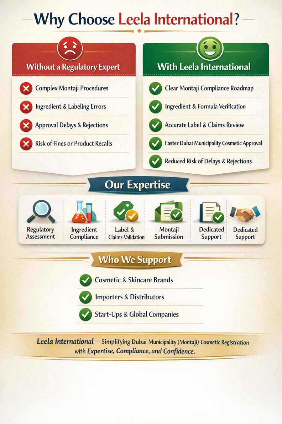 Leela International: Simplifying Dubai Municipality (Montaji) Cosmetic Registration with Expertise, Compliance, and Confidence.