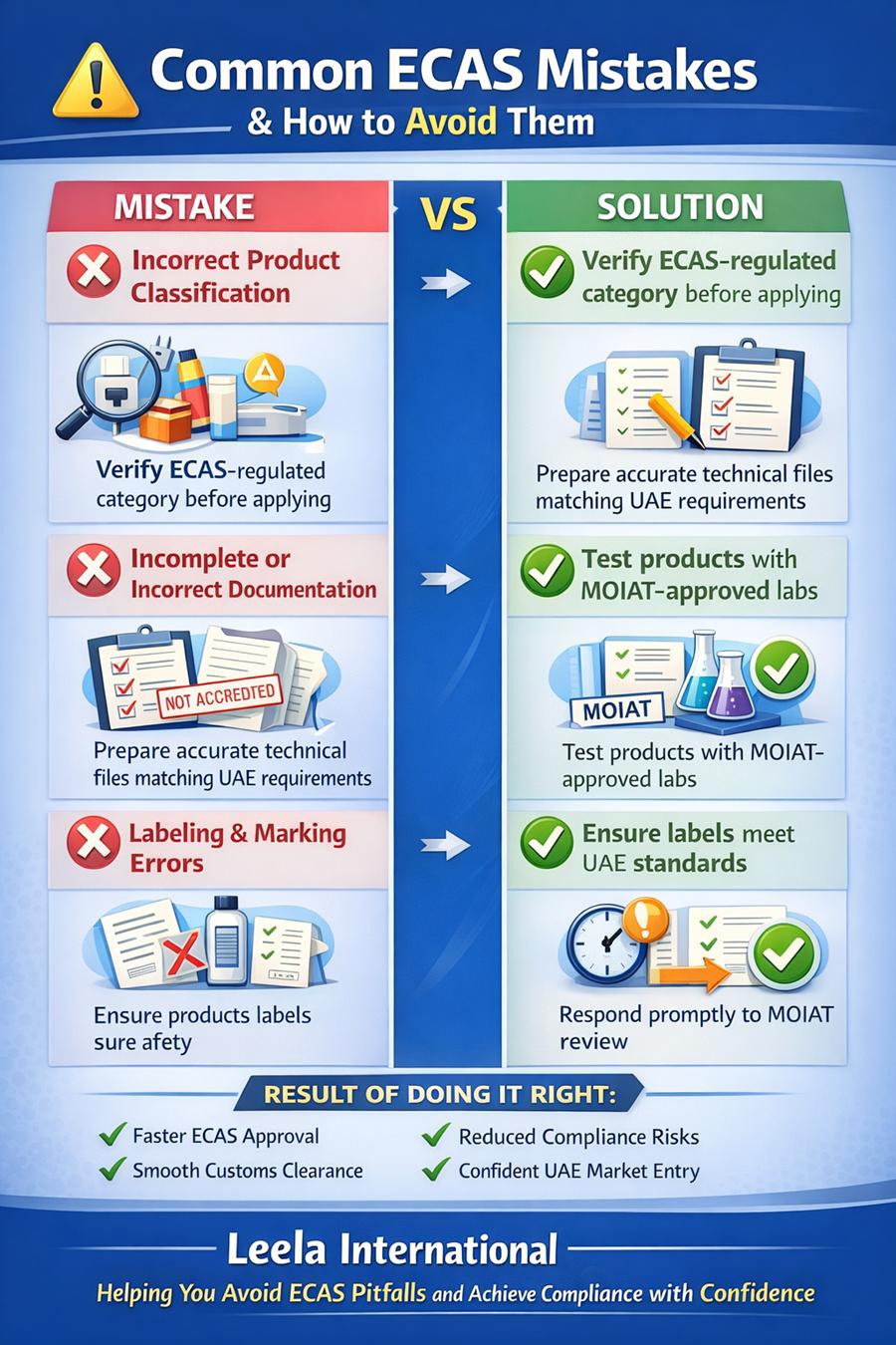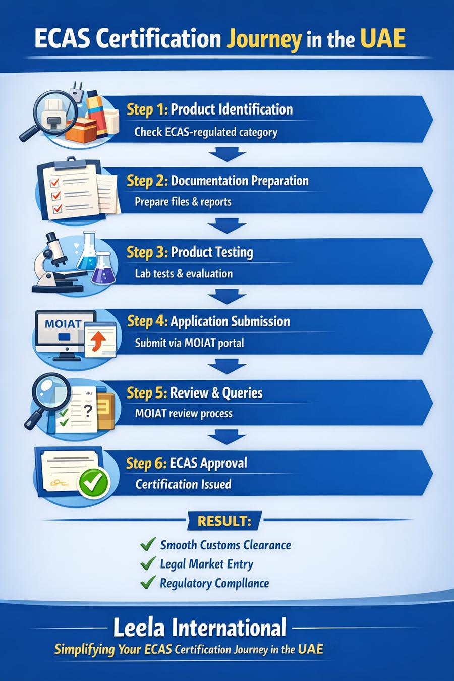 Leela International helps businesses to get ECAS compliance for the imported products efficiently by managing technical reviews, coordinating testing, and liaising directly with authorities. We provide end-to-end support from documentation review to final approval, ensuring accuracy, speed, and complete regulatory alignment so your products reach the UAE market without obstacles.
