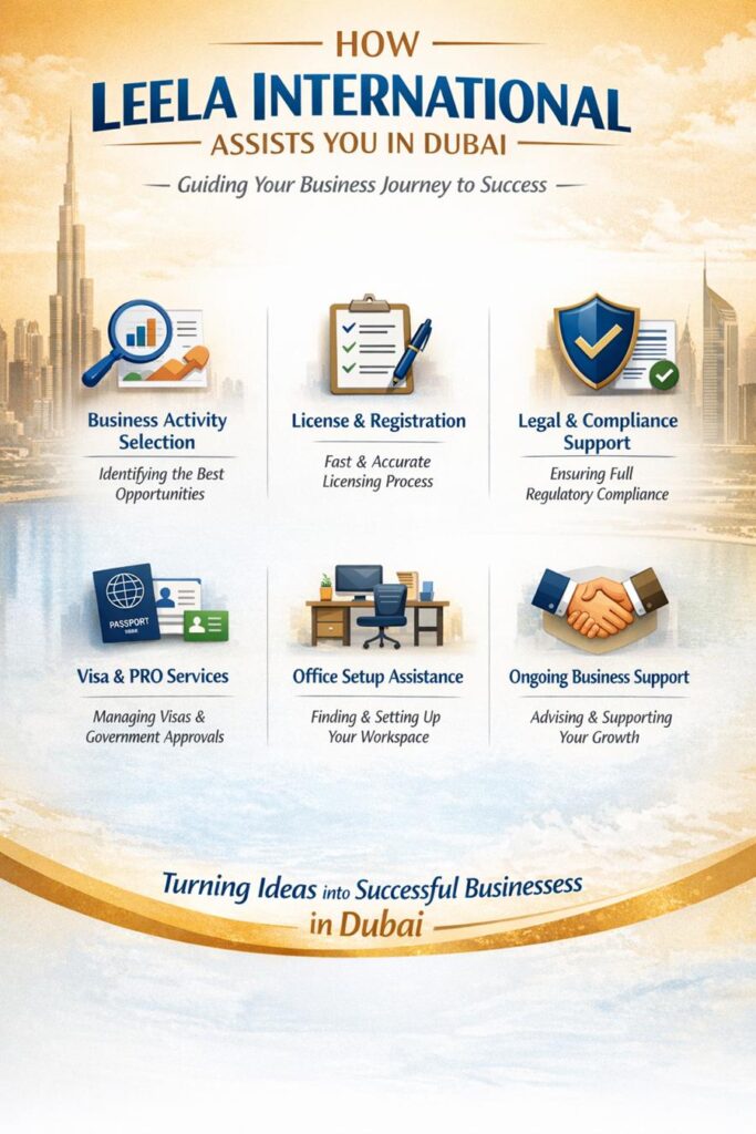 The guide provides information about the most common business start-up methods that require minimal effort for entrepreneurs who want to establish an easy business setup in Dubai, and it explains how Leela International assists clients from the initial concept stage through to obtaining their licenses without experiencing any stress, delays, or confusion.
