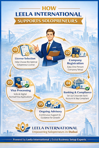 Leela International covers all aspects of solo business, including licensing and visas, advisory, and long-term support, ensuring your solo business journey in Dubai starts strong and stays future-ready.